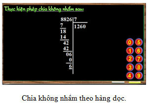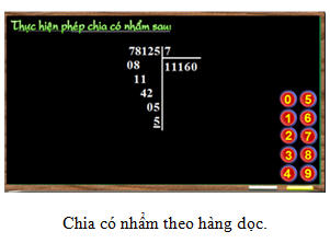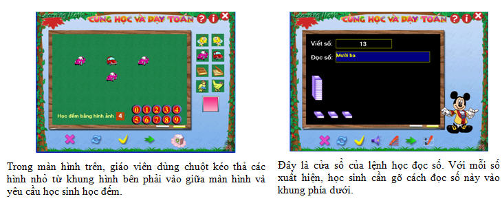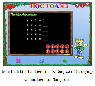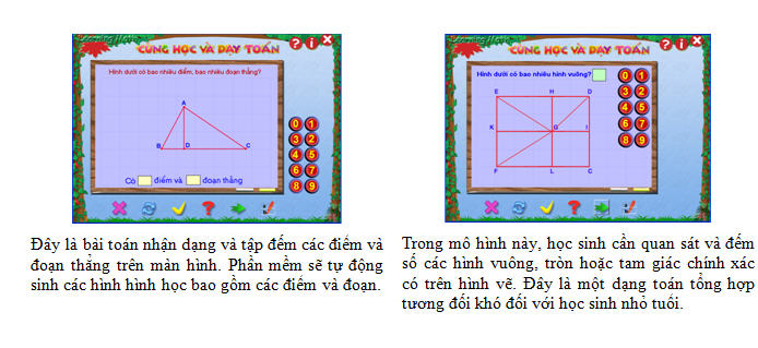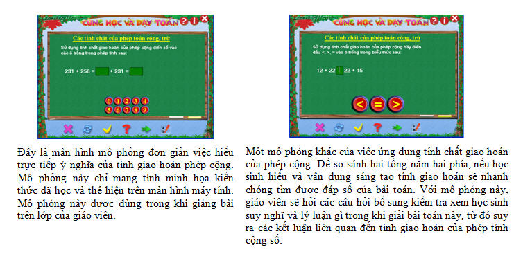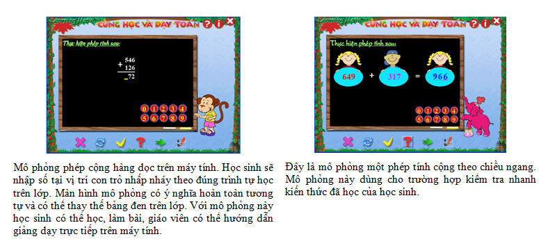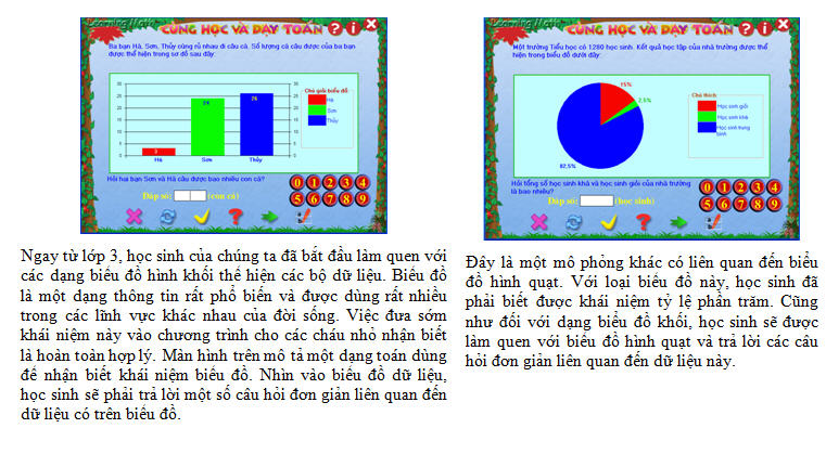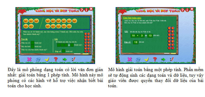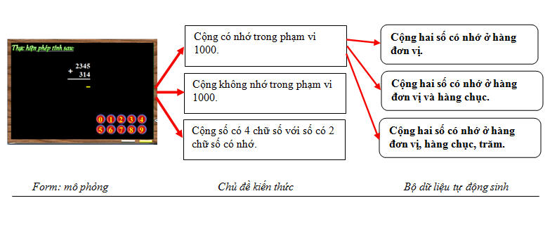 Các bộ dữ liệu đầu vào cho các dạng toán đều có 2 kiểu nhập liệu: - Người dùng nhập trực tiếp. - Phần mềm tự động sinh ngẫu nhiên dữ liệu. Để thực hiện được việc này cần thiết lập các thuật toán sinh dữ liệu tự động tương ứng. Vì số lượng các dạng toán và chủ đề kiến thức rất lớn trong chương trình môn Toán tiểu học nên nếu đặt vấn đề sinh tự động dữ liệu thì công việc sẽ rất lớn và rất phức tạp. Mô phỏng kiến thức trên máy tính là một trong các công việc quan trọng nhất của phần mềm khi muốn tin học hóa việc học và dạy trên máy tính. Với mỗi chủ đề kiến thức có thể có nhiều kiểu mô phỏng, minh họa khác nhau trên máy tính. Sau đây là một vài ví dụ cho việc đa dạng hóa sự mô phỏng kiến thức trên máy tính. Kiến thức | Mô phỏng 1 | Mô phỏng 2 | Phép cộng hai số tự nhiên |  |  | Phép chia hai số tự nhiên |  |  | Phân biệt và nhận biết các hình hình học |  |  |