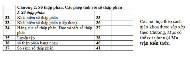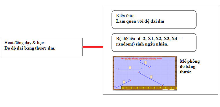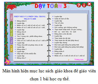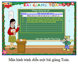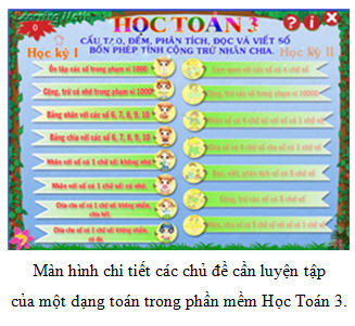 Mô hình bài học và bài giảng điện tử môn Toán cấp Tiểu học Mô hình bài học và bài giảng điện tử môn Toán đã được công ty nghiên cứu và thiết kế hoàn chỉnh trong các phần mềm Học và Dạy của các môn học này. Các bài giảng môn Toán có phần mở rộng *.math. 1. Các khái niệm chính Mô hình bài giảng Toán được xây dựng dựa trên các khái niệm được mô tả trong sơ đồ sau:  Ma trận kiến thức là bảng tập hợp các chủ đề kiến thức chính của môn học. Thông thường mô hình bảng Ma trận kiến thức được thiết kế theo mô hình cây thông tin. Tùy thuộc vào mô hình kiến thức cụ thể của từng môn học, tùy thuộc vào người thiết kế mà Ma trận kiến thức này có khuôn dạng cụ thể khác nhau. Ví dụ đối với môn Toán bậc tiểu học, ma trận kiến thức có thể hiện như các bài học trong sách giáo khoa. Các bài học này được chia thành các nhóm phân loại theo từng Lớp, Chương và các mục chủ đề con.  Bộ dữ liệu cho dạng toán là các thông số đầu vào, thông thường là các giá trị số được dùng trong kiểu, bài tập cụ thể tương ứng với chủ đề kiến thức nào đó. Tùy thuộc vào chủ đề kiến thức và dạng toán cụ thể mà bộ dữ liệu đầu vào này sẽ rất đa dạng và khác nhau. Bảng sau cho ta hình dung một số kiểu dữ liệu đầu vào cụ thể của các dạng toán khác nhau trong chương trình môn Toán bậc tiểu học. Chủ đề kiến thức | Bộ dữ liệu đầu vào | Ghi chú | Cộng hai số không nhớ trong phạm vi 100 | X, Y | Các số tự nhiên X, Y hoặc tự nhập, hoặc do phần mềm sinh ngẫu nhiên nhưng luôn phải thỏa mãn tạo thành phép cộng không nhớ có tổng không vượt quá 100. | Nhân số có 3 chữ số với số có một chữ số, không nhớ | X, d | Giá trị X, d phải thỏa mãn điều kiện của chủ đề kiến thức là 100 < X < 999, 1 < d < 9 và phép nhân X.d là không nhớ. | Đo độ dài đoạn thẳng bằng thước | d, X1, X2, X3, X4 | X1, X2, X3. X4 là độ dài 4 đoạn thẳng sẽ hiện trên màn hình để học sinh tiến hành đo bằng thước. d - đơn vị đo của thước. d = 1, độ đo dm d = 2, độ đo cm d = 3, độ đo mm |