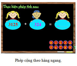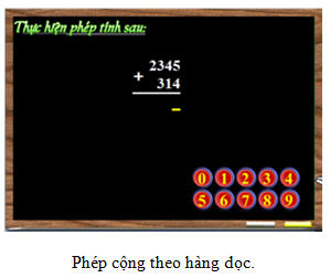 Như vậy việc mô phỏng việc học và dạy Toán trên máy tính được mô phỏng thông qua 3 khái niệm quan trọng là Kiến thức - Dữ liệu - Mô phỏng. Các đối tượng này có quan hệ chặt chẽ với nhau và kết hợp lại thành những HOẠT ĐỘNG DẠY & HỌC. Chú ý: Một mô phỏng dạng toán (gọi là FORM) có thể tương ứng với nhiều chủ đề kiến thức và nhiều bộ sinh dữ liệu khác nhau. Ví dụ sau minh họa cho trường hợp mô phỏng phép cộng hai số tự nhiên theo hàng dọc.