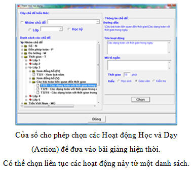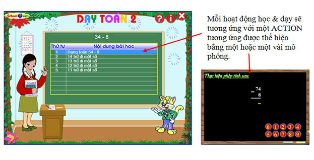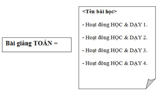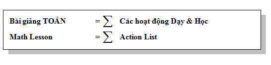 Nguời dùng (giáo viên) sẽ làm việc trực tiếp với các tệp bài giảng (điện tử) này. Mỗi hoạt động tương ứng với một dòng trong tệp bài giảng và tương ứng với một bộ thông tin bao gồm: chủ đề kiến thức + Form mô phỏng + thuật toán sinh dữ liệu. Một bộ ba thông tin như vậy được gọi là một ACTION (hay HOẠT ĐỘNG). Như vậy mô hình bài giảng điện tử là một tập hợp các ACTION. Các ACTION đã được tạo trước trong phần mềm, giáo viên chỉ cần chọn các ACTION và đưa vào bài giảng của mình theo ý muốn. Ta có định nghĩa sau: Hoạt động Học và Dạy hay ACTION là một hoạt động tối thiểu, nhỏ nhất trong quá trình giảng dạy kiến thức môn học cho học sinh. Sơ đồ sau mô tả công thức chính của phần mềm Bài giảng TOÁN mô tả các bài giảng điện tử: