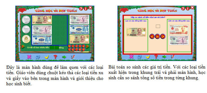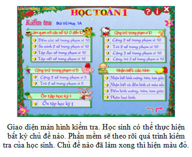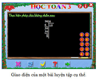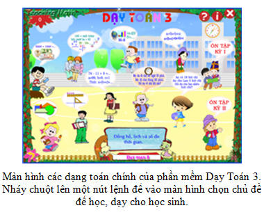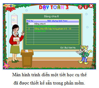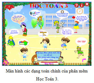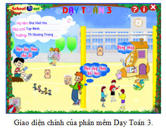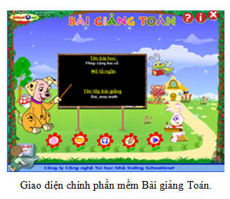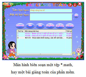 Bộ phần mềm Học Toán 1, 2, 3, 4, 5 Bộ phần mềm bao gồm 5 CD mô phỏng toàn bộ các dạng toán chính xác theo sách giáo khoa Toán các lớp 1, 2, 3, 5. Mỗi CD phần mềm dành cho học sinh học theo từng lớp học. Các chức năng chính bao gồm ôn luyện, làm bài tập theo từng chủ đề kiến thức. Có chức năng gia sư theo rõi, đánh giá, kiểm tra và cấp giấy chứng nhận hoàn thành chương trình Toán của từng lớp học cho từng học sinh tham gia học. Bộ phần mềm Dạy Toán 1, 2, 3, 4, 5 Bộ phần mềm bao gồm 5 CD mô phỏng chính xác theo từng tiết học của SGK môn Toán. Lần đầu tiên khái niệm Bài giảng Toán đã được đưa vào phần mềm, dựa trên khái niệm này, phần mềm đã xây dựng toàn bộ 817 tiết học chính xác theo từng tiết của SGK môn toán cho tất cả các lớp 1, 2, 3, 4, 5. Bộ phần mềm này dành cho giáo viên thực hiện bài giảng Toán theo từng tiết học của SGK trên máy tính. Phần mềm Bài giảng Toán 1.5 (Math Lesson 1.5) Là phần mềm cho phép giáo viên khởi tạo và làm việc với mô hình Bài giảng Toán cấp Tiểu học. Phần mềm đã tạo sẵn hơn 1700 hoạt động giảng dạy môn Toán phủ kín tất cả các dạng Toán và kiến thức môn Toán theo SGK. Dựa trên các hoạt động này, giáo viên sẽ thiết kế lấy cho mình các bài giảng điện tử môn Toán để trực tiếp giảng dạy trên lớp. Ví dụ với phần mềm này, giáo viên có thể thay đổi, sửa đổi các bài giảng môn Toán đã được tích hợp trong bộ phần mềm Dạy Toán 1, 2, 3, 4, 5. Phần mềm Bài giảng TOÁN cho phép giáo viên tiểu học thiết lập các bài giảng điện tử môn Toán dựa trên các hoạt động dạy học theo chương trình sách giáo khoa. Phần mềm đã mô phỏng toàn bộ tất cả các dạng toán phủ kín toàn bộ chương trình sách giáo khoa môn Toán từ lớp 1 đến lớp 5. Hơn 250 dạng toán chính phủ kín hơn 1700 chủ đề kiến thức đã được mô phỏng chi tiết trong phần mềm. Ngoài ra hơn 2500 thuật toán sinh dữ liệu tự động cho các dạng toán cũng đã được thiết kế trong phần mềm. Mỗi bài giảng toán được thiết lập trong phần mềm sẽ được lưu trữ dưới dạng một tệp *.math file. Tệp này rất nhỏ, gọn, dễ dàng sao chép và di chuyển từ máy tính này sang máy tính khác. Phần mềm Bài giàng TOÁN đóng vai trò như một công cụ thiết kế, soạn thảo bài giảng đồng thời có chức năng trình diễn bài giảng này trên máy tính.