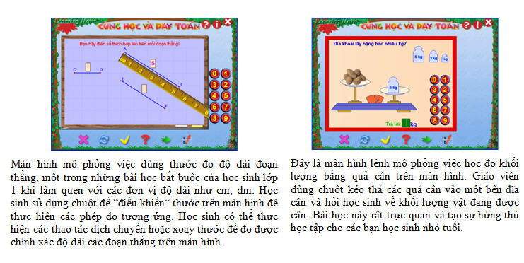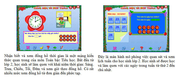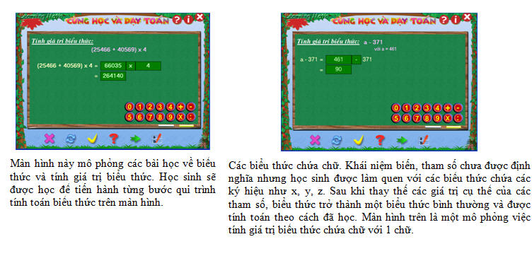 Có thể liệt kê tại đây các bài toán chính mà công ty School@net đã giải quyết trong thời gian vừa qua: - Tiến hành nghiên cứu và phân loại các dạng toán chính được học và dạy trong các trường Tiểu học theo sách giáo khoa mới của Nhà xuất bản Giáo dục phát hành. - Đối với mỗi dạng toán cần tiến hành mô phỏng chi tiết cách học, cách dạy trên máy tính, thông qua việc biểu dỉễn từng bước đúng theo qui trình mà giáo viên giảng dạy trên lớp cho học sinh. - Một trong những định hướng quan trọng của các mô phỏng này là tăng cường tính tương tác giữa người với máy tính. Với các tính năng tương tác đa dạng như vậy, phần mềm sẽ trở thành một công cụ hỗ trợ đắc lực cho việc học của học sinh và giảng dạy của giáo viên. - Một bài toán đặc biệt quan trọng nữa mà chúng tôi đã giải quyết là với mỗi dạng toán, phần mềm sẽ có chức năng tự động sinh các bộ dữ liệu chính xác theo phạm vi kiến thức được qui định trong sách giáo khoa. Đây là một công việc rất phức tạp đòi hỏi sự nghiên cứu kỹ lưỡng và công phu của nhóm thiết kế phần mềm. Với tính năng này phần mềm mô phỏng học và dạy Toán sẽ trở thành một cái “máy cái” có khả năng tự động sinh các bài tập chính xác theo từng phạm vi kiến thức và bài học của học sinh. Sau đây là danh sách các dạng toán chính đã được phân loại và mô phỏng. 1. Nhận biết, đọc, viết và phân tích số Dạng toán đầu tiên mà mỗi học sinh bậc Tiểu học cần học là các bài toán học nhận biết và đếm số, học đọc, học viết và phân tích số. Việc học này bắt đầu từ những buổi học đầu tiên của lớp 1 và kéo dài đến tận lớp 5 với khái niệm phân số và số thập phân. Các dạng toán cần mô phỏng là học đếm, học đọc, viết số, so sánh các số và cuối cùng là phân tích số.  2. Số và 4 phép toán với số Học 4 phép toán cộng, trừ, nhân, chia các số là một trong những phạm vi kiến thức lớn nhất của chương trình toán Tiểu học. Tổng thời lượng cho các dạng toán này chiếm hơn 60% tổng thời gian của chương trình. Đây là mảng kiến thức được mô phỏng đa dạng nhất và cũng là phức tạp nhất. Các dạng toán chính bao gồm việc mô phỏng phép toán cộng, trừ 2 số không nhớ và có nhớ, phép nhân có nhớ và không nhớ, phép chia có nhẩm hoặc không nhẩm, chia hết và chia có dư. Đối với phân số, cần mô phỏng các dạng toán rút gọn phân số, qui đồng mẫu số hai phân số, phép cộng, trừ, nhân chia phân số. Đối với số thập phân việc mô phỏng phép chia là phức tạp hơn cả. Đây có lẽ là nhóm các bài toán khó mô phỏng nhất trong toàn bộ các dạng toán bậc Tiểu học.  3. Đo lường và các tính toán với đơn vị đo lường Tiếp theo các số là các đại lượng đo lường là những phạm vi kiến thức được học và dạy khá nhiều trong chương trình môn Toán. Các đại lượng đo lường chính được đưa vào bậc tiểu học bao gồm đo độ dài, đo diện tích, thể tích và đo khối lượng. Các dạng toán trong khối kiến thức này bao gồm: làm quen với các độ đo, so sánh độ đo, đổi đơn vị đo và thực hiện các tính toán, phép tính trên độ đo.  4. Đồng hồ, lịch và số đo thời gian Thời gian và các khái niệm liên quan đến thời gian như đồng hồ, giờ, phút, tháng, năm, xem lịch được giảng dạy rất cẩn thận trong chương trình môn Toán Tiểu học từ lớp 2 đến lớp 5.  5. Tiền Việt Nam Tiền Việt Nam là một đơn vị đo lường đặc biệt và được giảng dạy trong chương trình toán cho học sinh tiểu học. Ngoài ý nghĩa như một đơn vị đo lường thông thường, tiền còn có rất nhiều ý nghĩa thực tế mà mỗi học sinh chắc đã được làm quen trong đời sống hàng ngày. Các dạng toán liên quan đến tiền Việt Nam bao gồm: làm quen với các loại tiền, tiền xu và tiền giấy, các dạng tính toán với tiền, bài toán đổi tiền, so sánh giá trị tiền.  Trong việc đưa ứng dụng CNTT vào nhà trường, các phần mềm mô phỏng quá trình học tập, giảng dạy đóng vai trò rất quan trọng. Thông thường các phần mềm này có tính chuyên sâu và chuyên nghiệp cao. Hiện nay một số nhà trường và giáo viên còn nhầm lẫn trong việc phân biệt các phần mềm trình diễn (kiểu PowerPoint) với các phần mềm mô phỏng học tập. 6. Biểu thức và tính giá trị biểu thức toán học Ớ bậc Tiểu học, song song với việc học tính toán các phép tính cộng, trừ, nhân, chia các số, học sinh bắt đầu từ lớp 3 sẽ được làm quen với khái niệm biểu thức toán học và cách tính giá trị của biểu thức toán học. Biểu thức toán học là một khái niệm quan trọng, cơ sở và trung tâm của toàn bộ nền tảng khoa học tư duy Toán học. Bắt đầu từ lớp 3, học sinh sẽ được làm quen với các “biểu thức” toán học cơ bản với các phép toán cộng, trừ, nhân, chia xen kẽ giữa các số trong biểu thức. Bài học đầu tiên là học cách tính giá trị biểu thức tuần tự